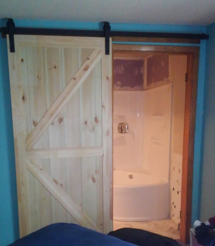 We have been remodeling our bathroom for two years now! I finally made an executive decision to have the same construction company work on our bathroom. Trenton is very handy but we both discovered that bathroom work is over our head. The crew came in and put the sub flooring in, laid vinyl, refitted the toilet, installed the tub and shower surround, put drywall in, taped and mudded, and hung the new door. They also shimmied into the crawl space to find out how the exhaust fan above the shower was vented. Apparently it was vented into the attic space above our room which is very bad. They cut a whole into the roof so they could vent it out properly. That leaves us with paint, putting up wainscoting, and trim. Skills we can handle. We have been sanding and coating poly on trim for the last few days. The walls are primed and painted. It is inching closer to being done and I am so excited to see the room finally progressing.